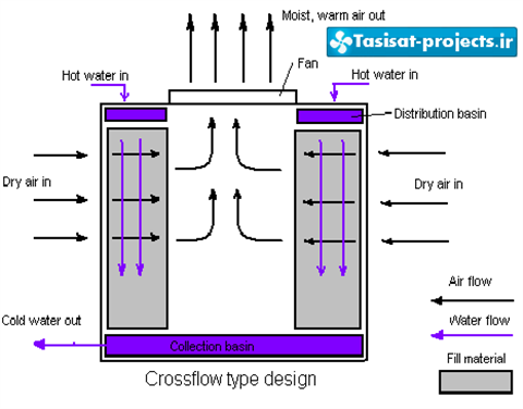 برج خنک کن با جریان هوای متقاطع:دراین حالت هوایی که از محیط بیرون وارد برج میشود بصورت متقاطع با جریان آب برخورد میکند .