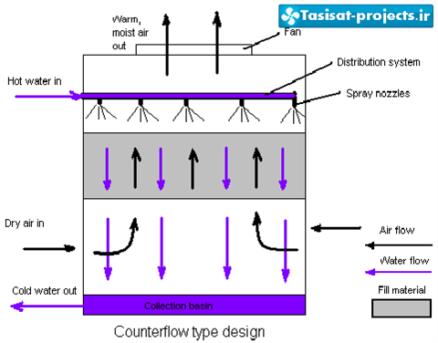 برج خنک کن با جریان هوای مخالف : در این حالت جریان هوا بصورت مخالف با جریان آب برخورد میکند. مطابق شکل